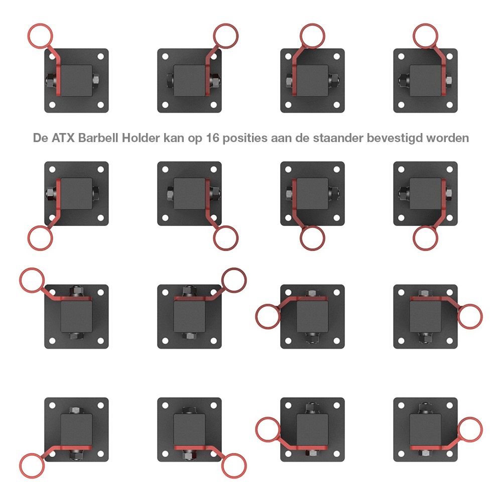Der ATX Barbell Holder is een praktisch accessoire voor het opbergen van een olympische halterstang. Deze houder is specifiek ontworpen voor de nieuwe ATX Rigs 4.0 en kan dankzij het ingenieuze ontwerp in 16 verschillende posities aan de staander bevestigd worden. Zo is de halterstang altijd binnen handbereik en kan deze na de training ruimtebesparend worden opgeborgen.