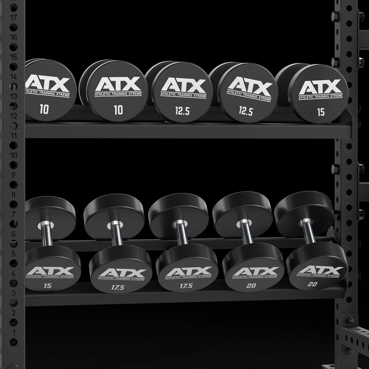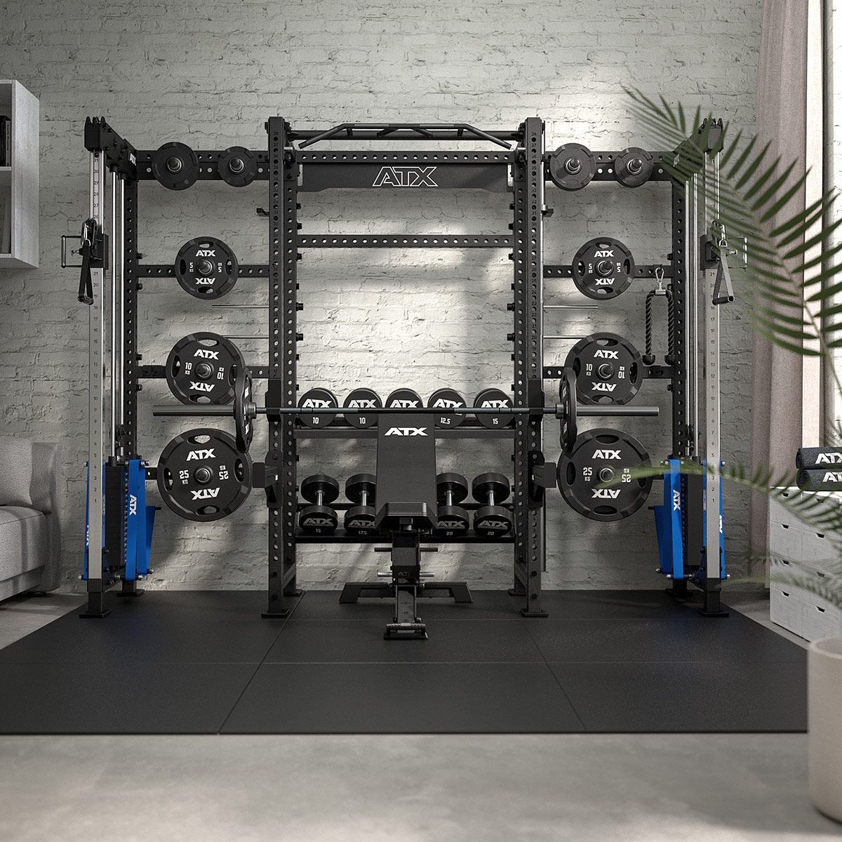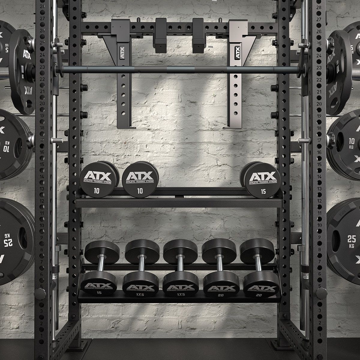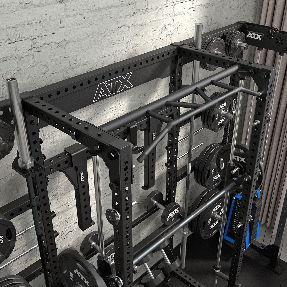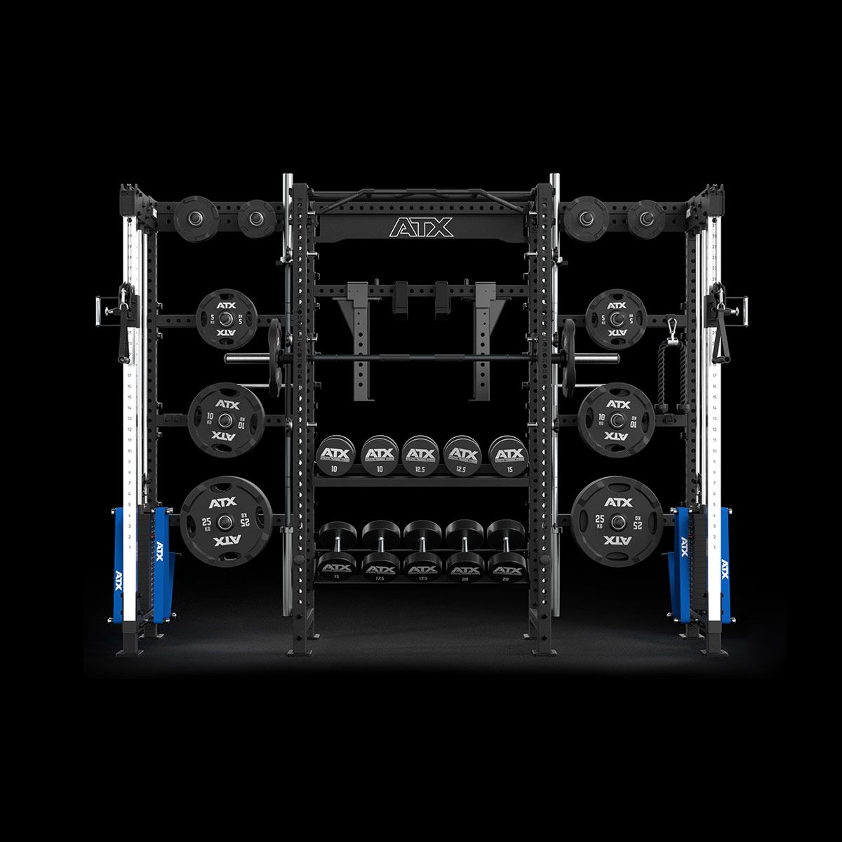 Het ATX Cable Cross Rack CCR-600 maakt een fundamentele reeks oefeningen mogelijk op een compact oppervlak. Dit rack bestaat uit een squat rack, cable crossover en opbergsysteem in één toestel. Het squat rack is uitgerust met J-hooks en spotter arms voor een veilige training. De J-hooks en spotter arms zijn voorzien van kunststof bescherming aan de binnen- en buitenzijde, om zowel het rack als de halterstang te beschermen. De cable crossover is uitgerust met twee gewichtstapels van elk 90 kg en dankzij de geïntegreerde pinnen voor het bevestigen van weerstandsbanden kan het gewicht nog aanzienlijk worden verhoogd. De kabels zijn in hoogte verstelbaar voor alle relevante trainingsposities. Een uitgebreid opbergsysteem biedt voldoende ruimte voor halterschijven, halterstangen, dumbbells en accessoires. Het ATX Cable Cross Rack is Europees gecertificeerd naar EN 20957 I.II.IV Class S voor professionele toepassingen. Het rack is naar wens uitbreidbaar met veel andere accessoires zoals een smith machine, jammer arms, landmine, dip bars, belt squat en nog veel meer.