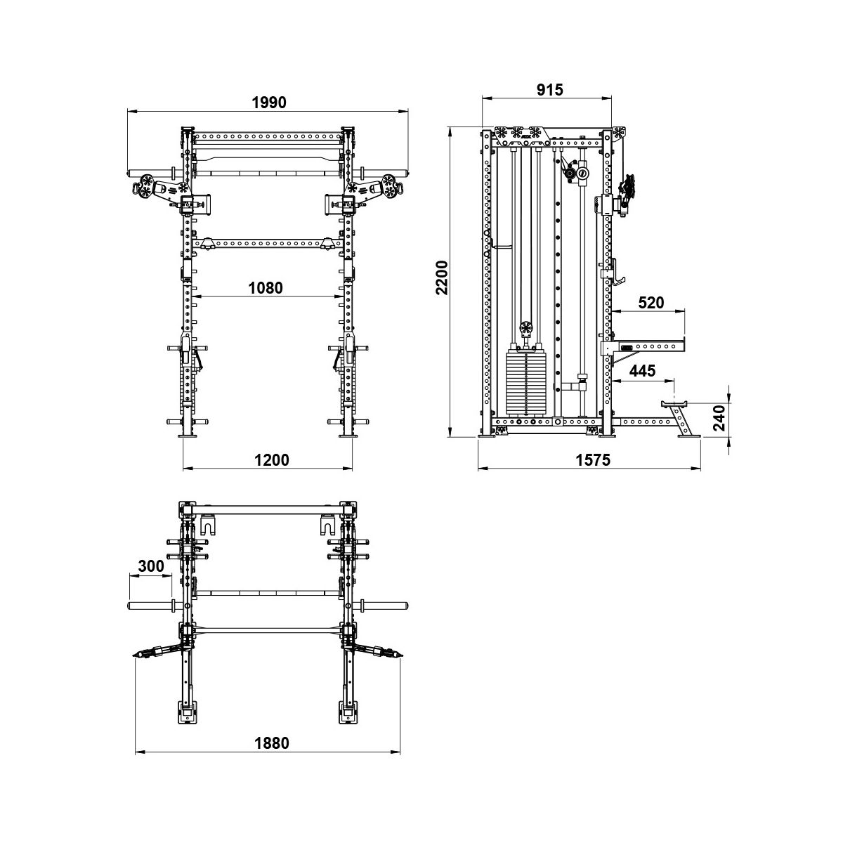 | Belastbaarheid | J-hooks: 500 kg Spotter arms: 300 kg Smith machine: 200 kg Optrekstang: 200 kg |