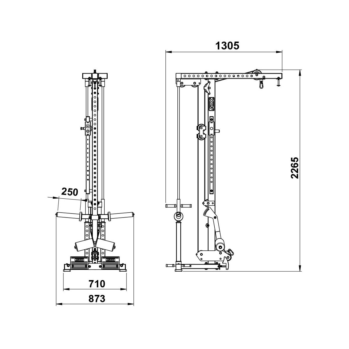 Met een hoogte van 226,5 cm en een diepte van 130,5 cm biedt deze lat pulldown-optie voldoende ruimte voor diverse oefeningen. De 50 mm schijfhouders zijn geschikt voor standaard gewichtsschijven, waardoor je eenvoudig je gewenste weerstand kunt instellen. De stevige constructie en het ontwerp zorgen voor een stabiele en veilige trainingservaring.