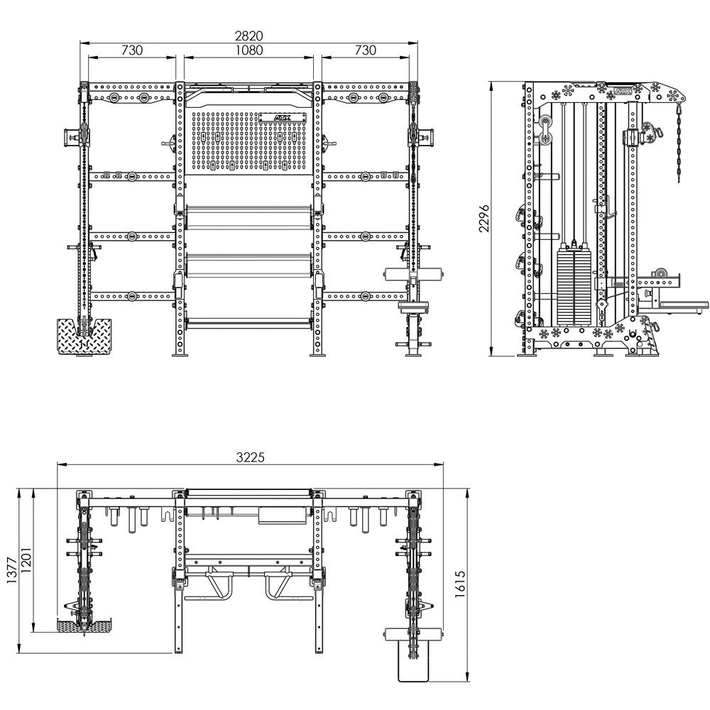 Het ATX Multi Cable Rack MCR-780 "The Wall" is een compleet uitgerust squat rack met geïntegreerde cable crossover, lat pulldown, low row en een opbergsysteem. Het doel van de ontwikkeling van dit rack was om een compleet trainingstoestel te ontwerpen dat aan alle behoeften van een professionele trainingsruimte voldoet en tegelijkertijd overzicht en orde creëert. Door de verschillende trainingsstations op een rij te plaatsen met kruislings verbonden opbergsystemen ontstaat een karakteristieke oefenwand. In dit toestel zijn uitsluitend professionele basisstations zonder compromissen geïntegreerd. Zo is de lat pulldown een volwaardige en professionele uitvoering met een 125 kg gewichtstapel met een direct verhouding van 1:1. Ook heeft deze een in hoogte verstelbare zitting en verstelbare beenrollen. Aan het andere uiteinde van het toestel bevindt zich nog een 125 kg gewichtstapel met dezelfde 1:1 verhouding voor zittend roeien, inclusief uitschuifbare voetensteun voor een veilige training. Daarnaast zijn deze kabelstations ook nog voorzien van in hoogte verstelbare katrollen (gewichtsverhouding 2:1), waardoor diverse trekhoogtes nauwkeurig kunnen worden ingesteld om een cable crossover na te bootsen. Tot slot is het geïntegreerde squat rack uitgerust met stevige stalen J-hooks en spotter arms en een verstelbare multigrip-optrekstang.