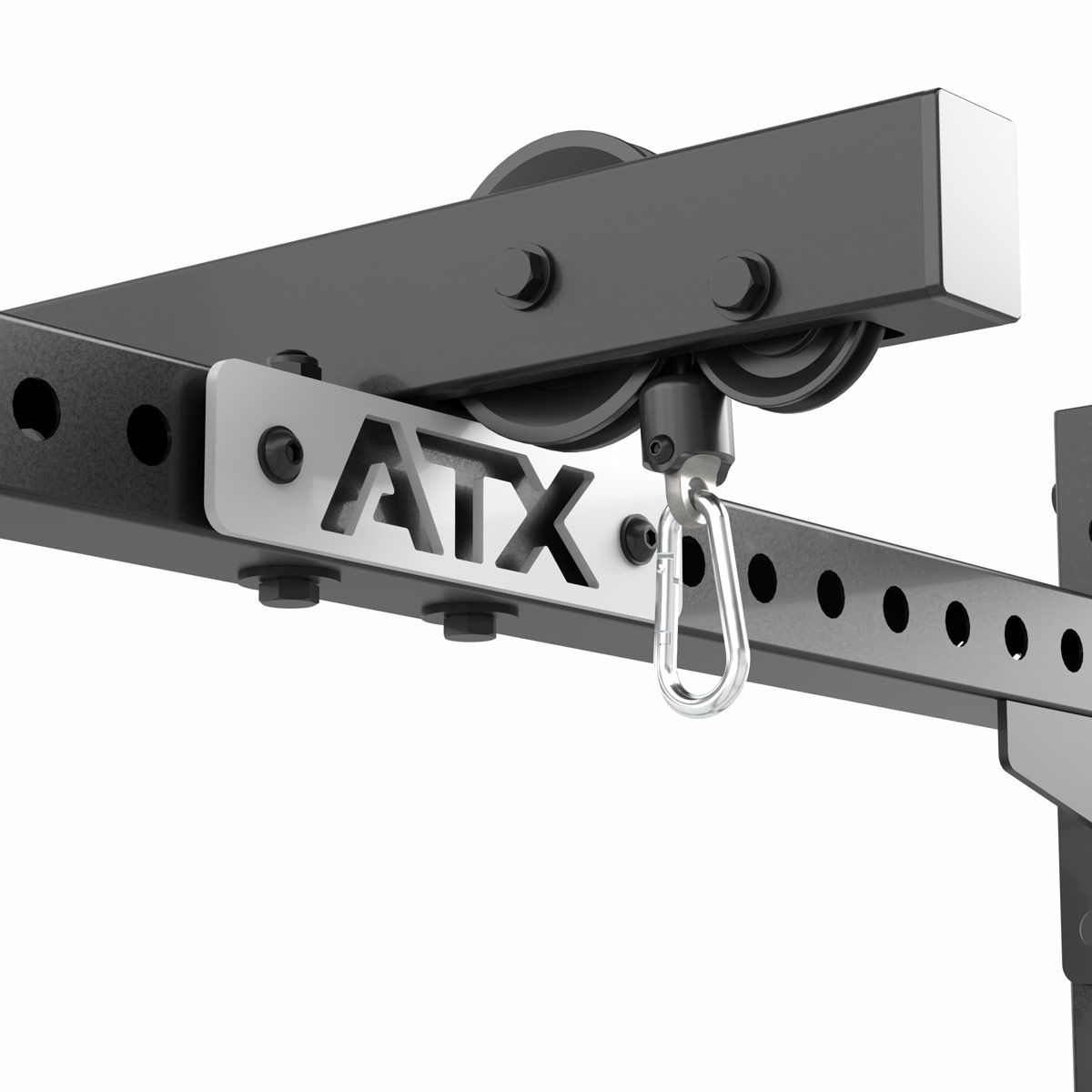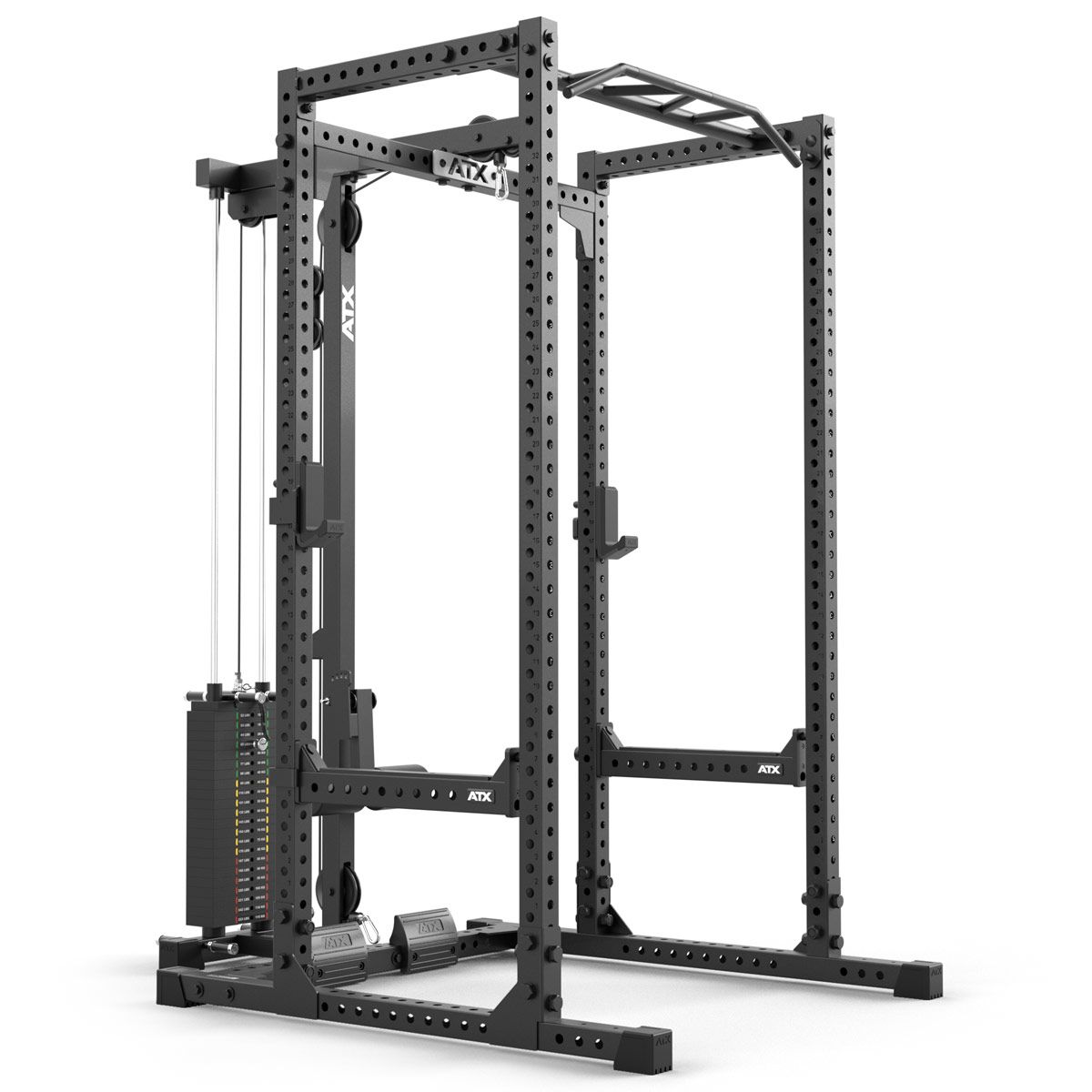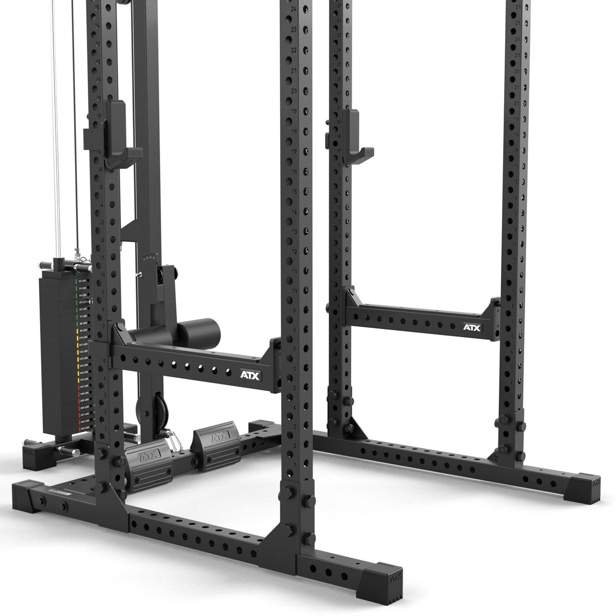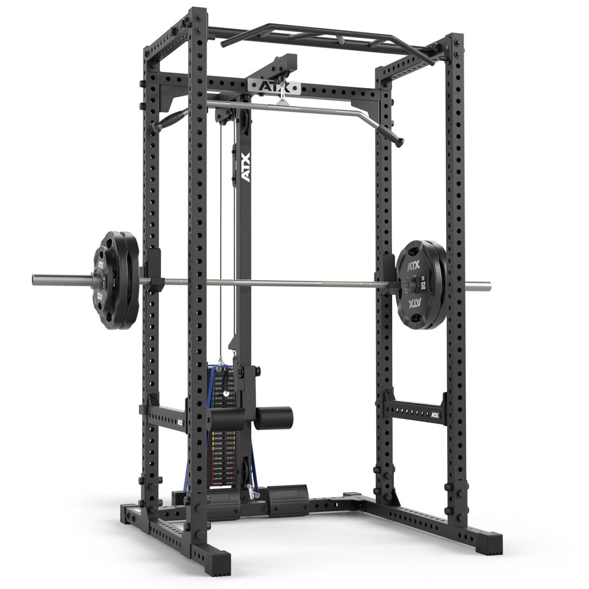 Dit power rack is uitbreidbaar met diverse optioneel verkrijgbare accessoires, waaronder een smith machine, dip bars, spotter arms, bandpinnen, landmine en utility seat. De lat pulley is een uitbreiding voor ATX racks en kan niet als losstaand toestel worden gebruikt. De afgebeelde accessoires zoals kettingen, halterschijven, power bands, etc. zijn niet inbegrepen.