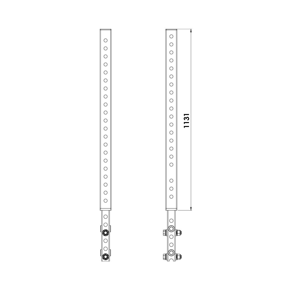 De extension is gemaakt van hetzelfde stevige 70 x 70 x 3 mm staal als de standaard ATX staanders, waardoor alles perfect aansluit. Het gatenraster loopt netjes door, je bevestigt hem met de meegeleverde verzinkte M20 bouten, en je bent direct klaar voor gebruik. Robuust, stabiel en studio-gecertificeerd, precies wat je van ATX mag verwachten.