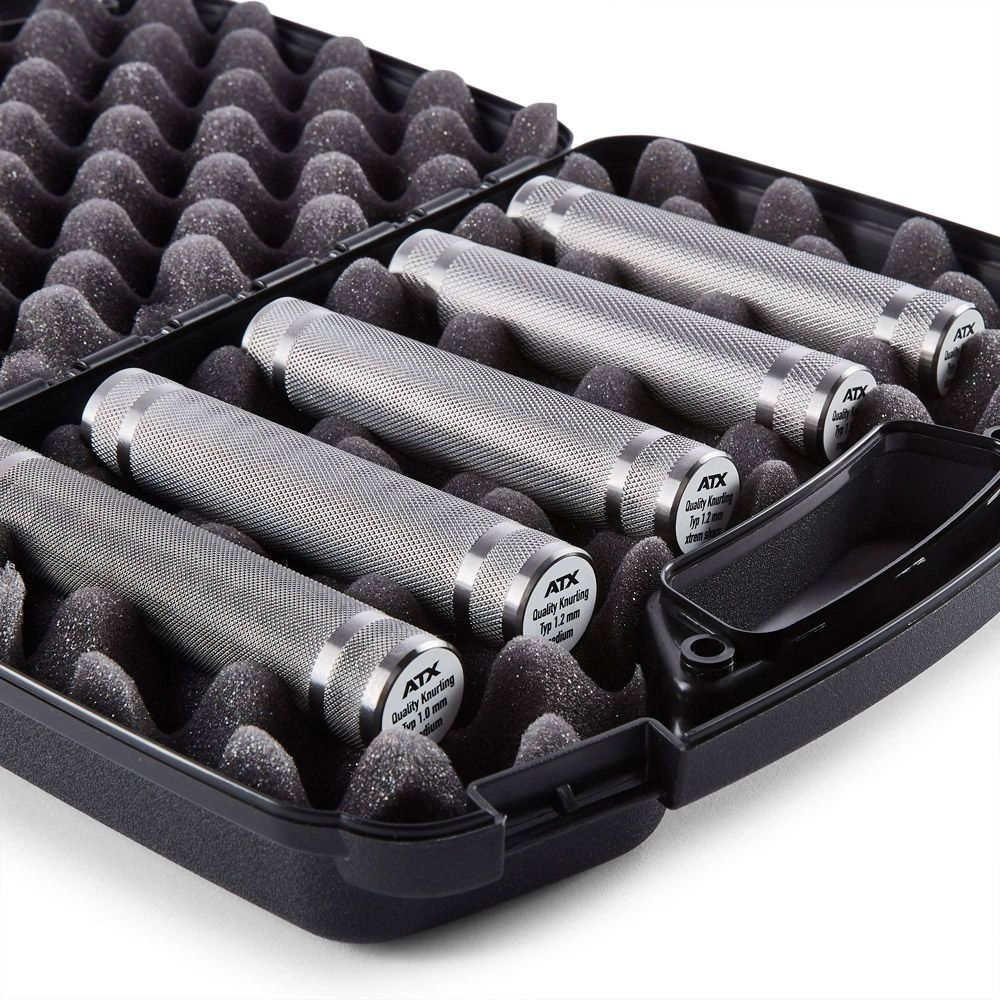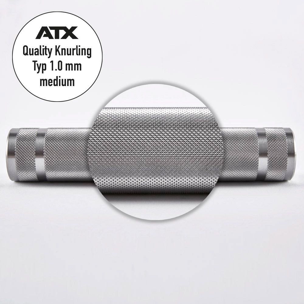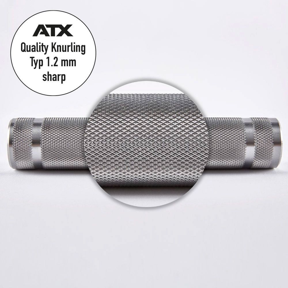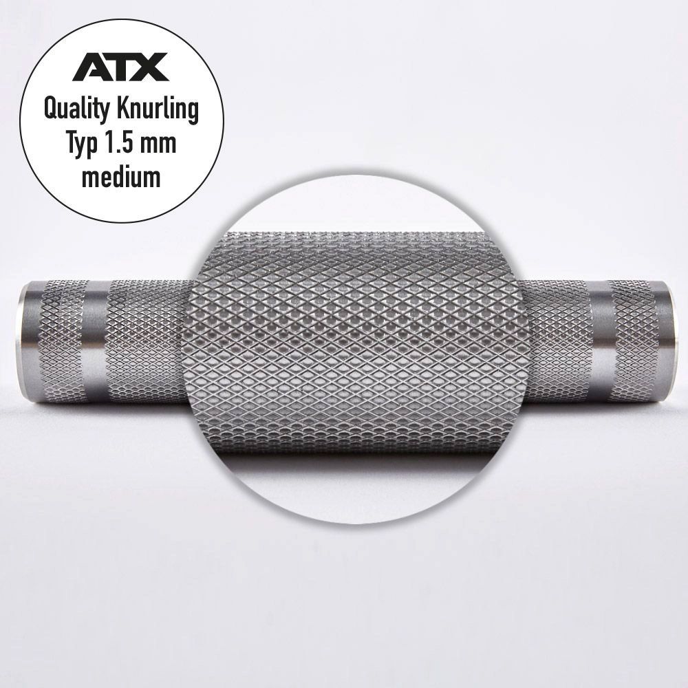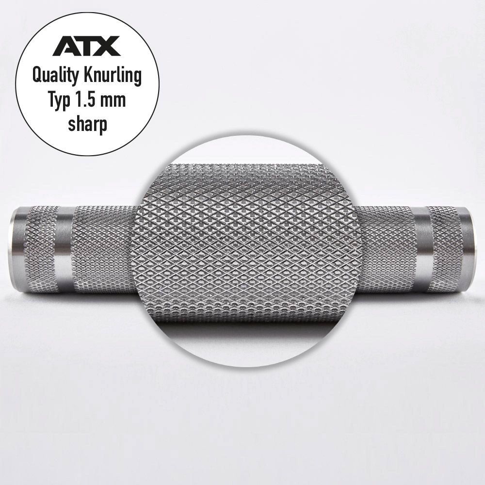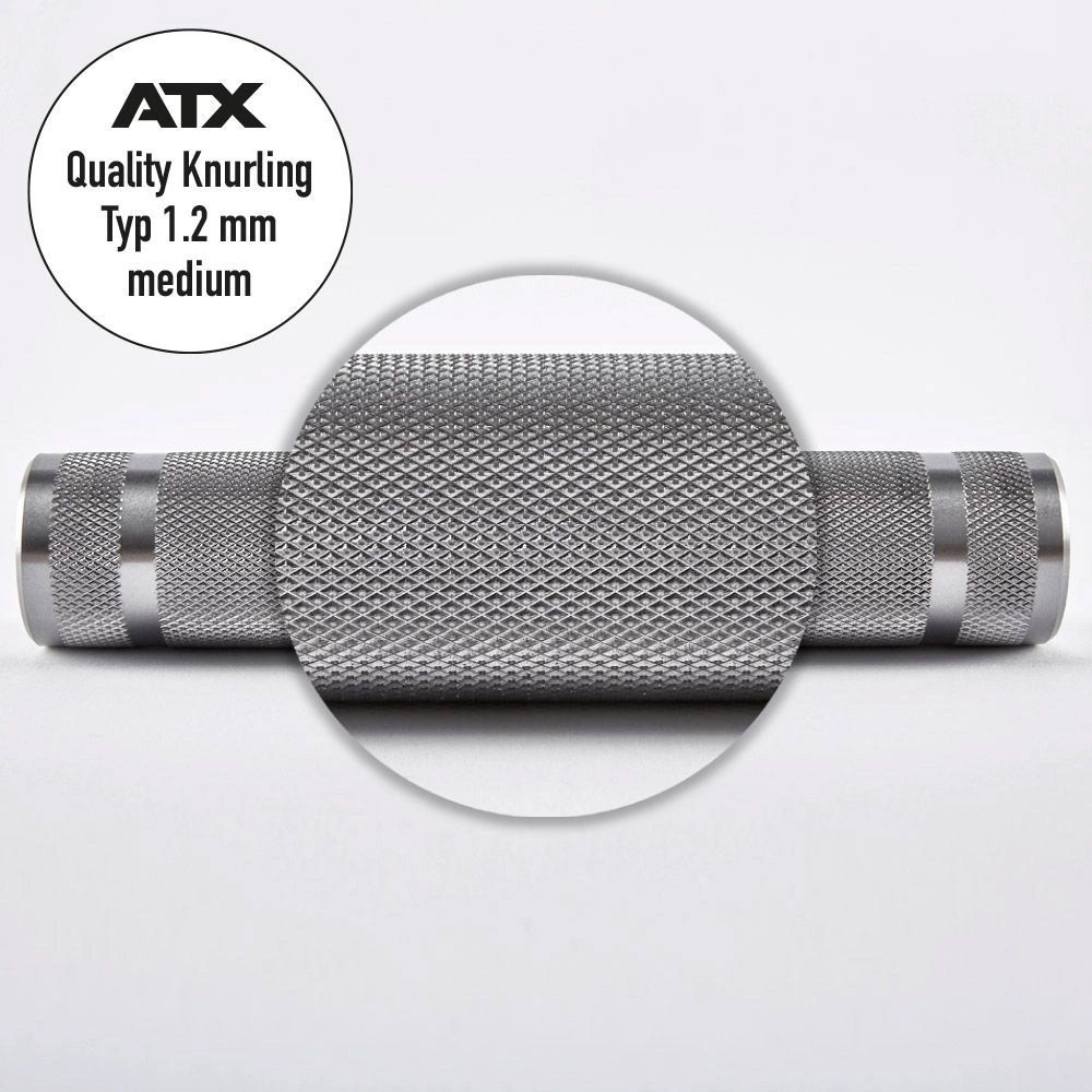 Standaard wordt deze halterstang geleverd met grove 1,5 mm volcano knurling. Op aanvraag kan er een andere knurling worden aangebracht, vraag de ATX Knurling Sample Box aan om alle knurling opties op voorhand uit te proberen en je ideale grip te bepalen.